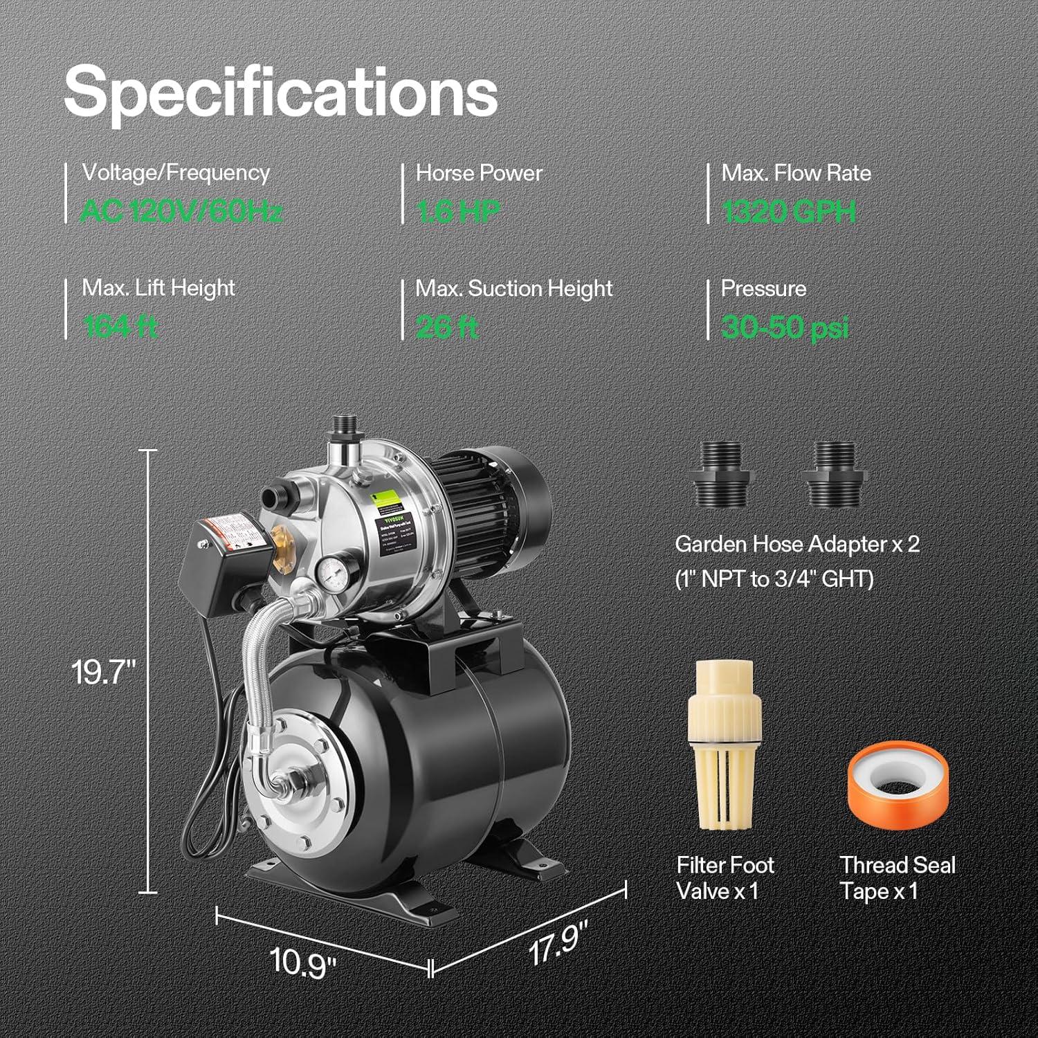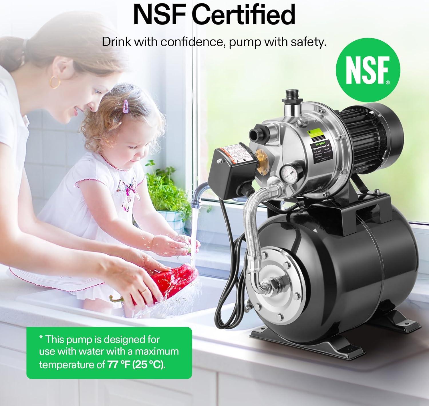 NSF Certified & Durable Build: This NSF-61 and ETL certified pump guarantees top-tier quality and safe operation; The stainless steel pump head is ultra-sturdy, rustproof and corrosion-resistant; Package includes thread seal tape, two garden hose adapters, and a filter foot valve for added convenience