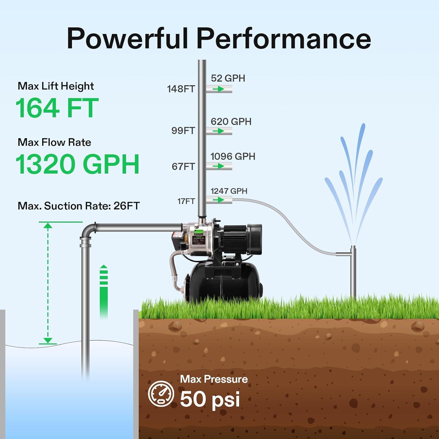 Strong Performance: This garden pump provides powerful water transfer with a max flow rate of 1,320 GPH, a max suction height of 26 ft, and a max lift height of 164 ft; It efficiently moves water from low areas like wells to higher spots such as water towers