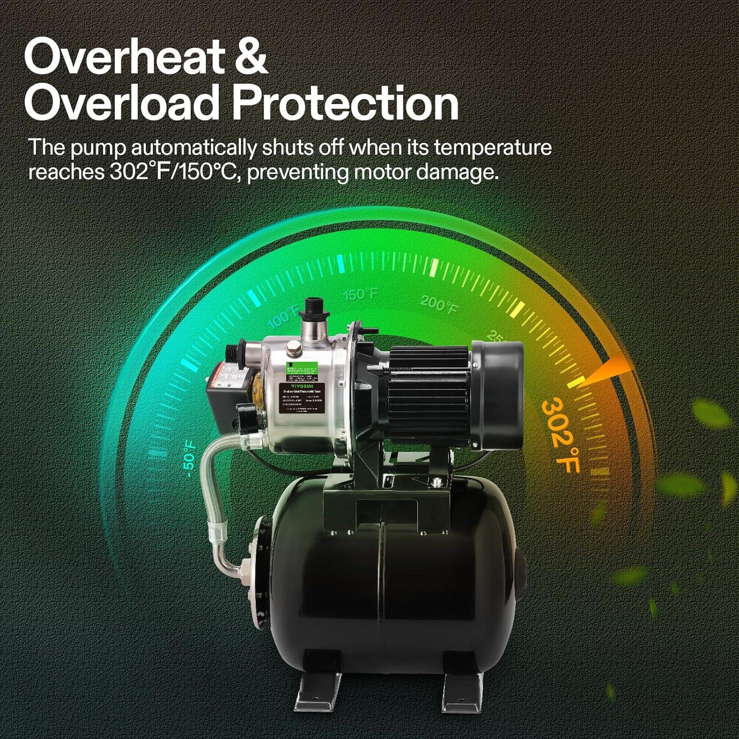 Overheat & Overload Protection: Equipped with overheat and overload protection, this pump prevents motor damage for safe, extended use 【Note: Always fill the pump head with water before use!】
