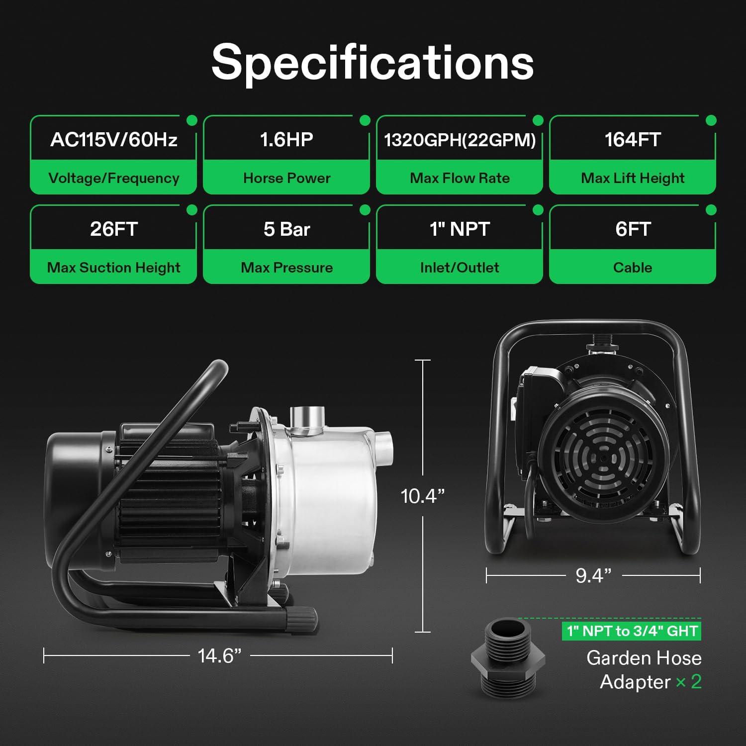 NSF Certified & Durable Build: This NSF-61 and ETL certified pump guarantees top-tier quality and safe operation; The stainless steel pump head is ultra-sturdy, rustproof and corrosion-resistant; Package includes thread seal tape, two garden hose adapters, and a filter foot valve for added convenience