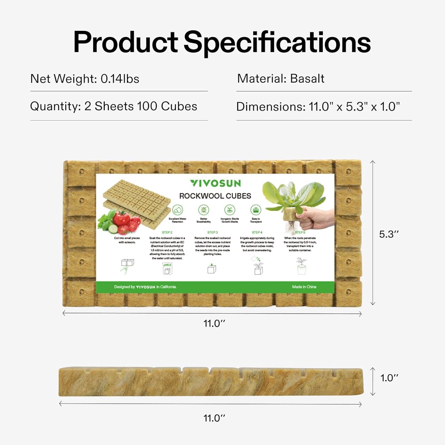 VIVOSUN 1 Inch Rockwool Cubes, Grow Cubes for Hydroponics, Cuttings, Cloning, Plant Propagation, Seed Startling, 2 Sheets 100 Plugs(1"-200 Plugs)