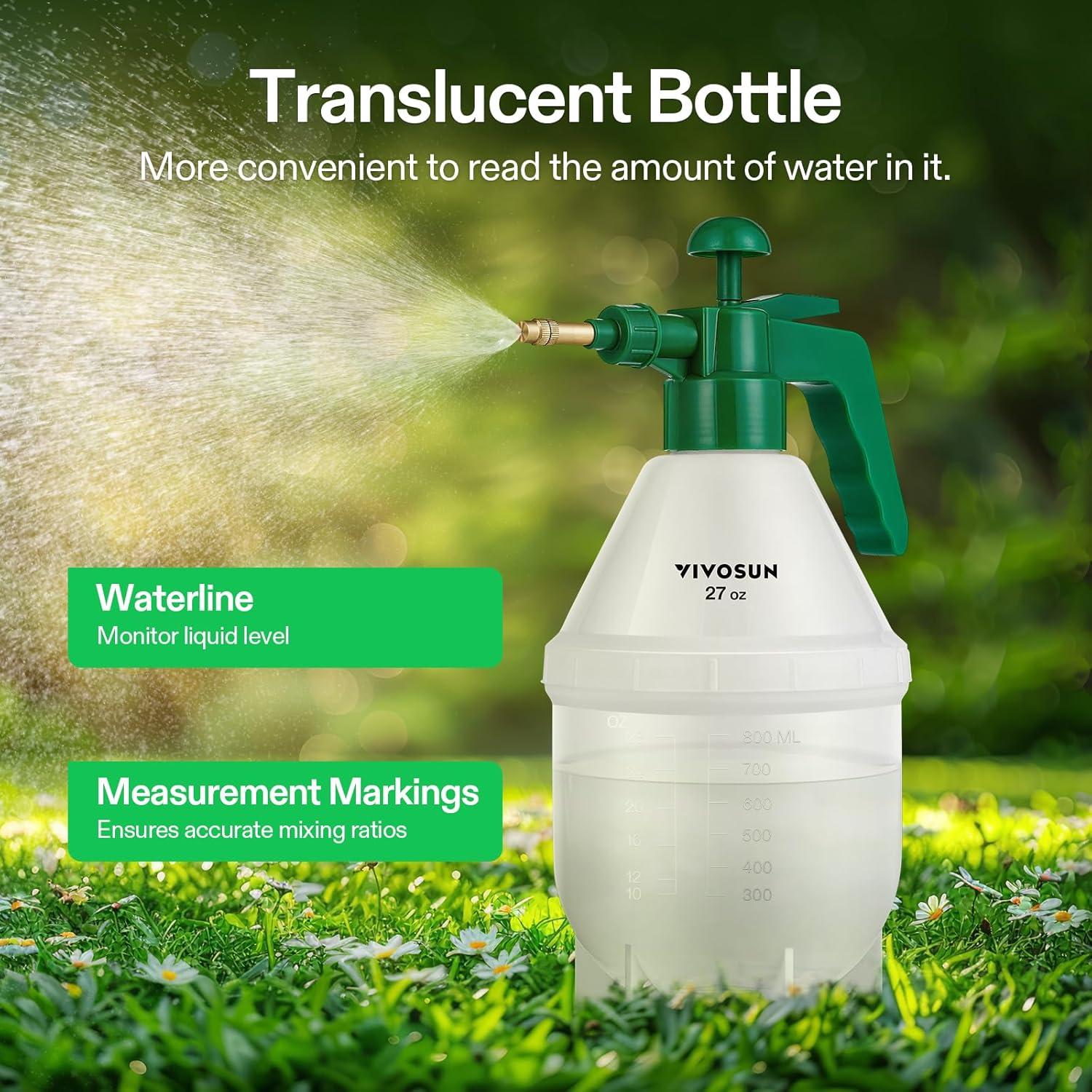 Multi-Functional: VIVOSUN 27-ounce handheld pump sprayer designed for spraying plants, car cleaning & maintenance, pet bathing and more indoor or outdoor cleaning solutions; Especially suitable for indoor use; This product is tested to ensure safety at water temperatures up to 131°F
