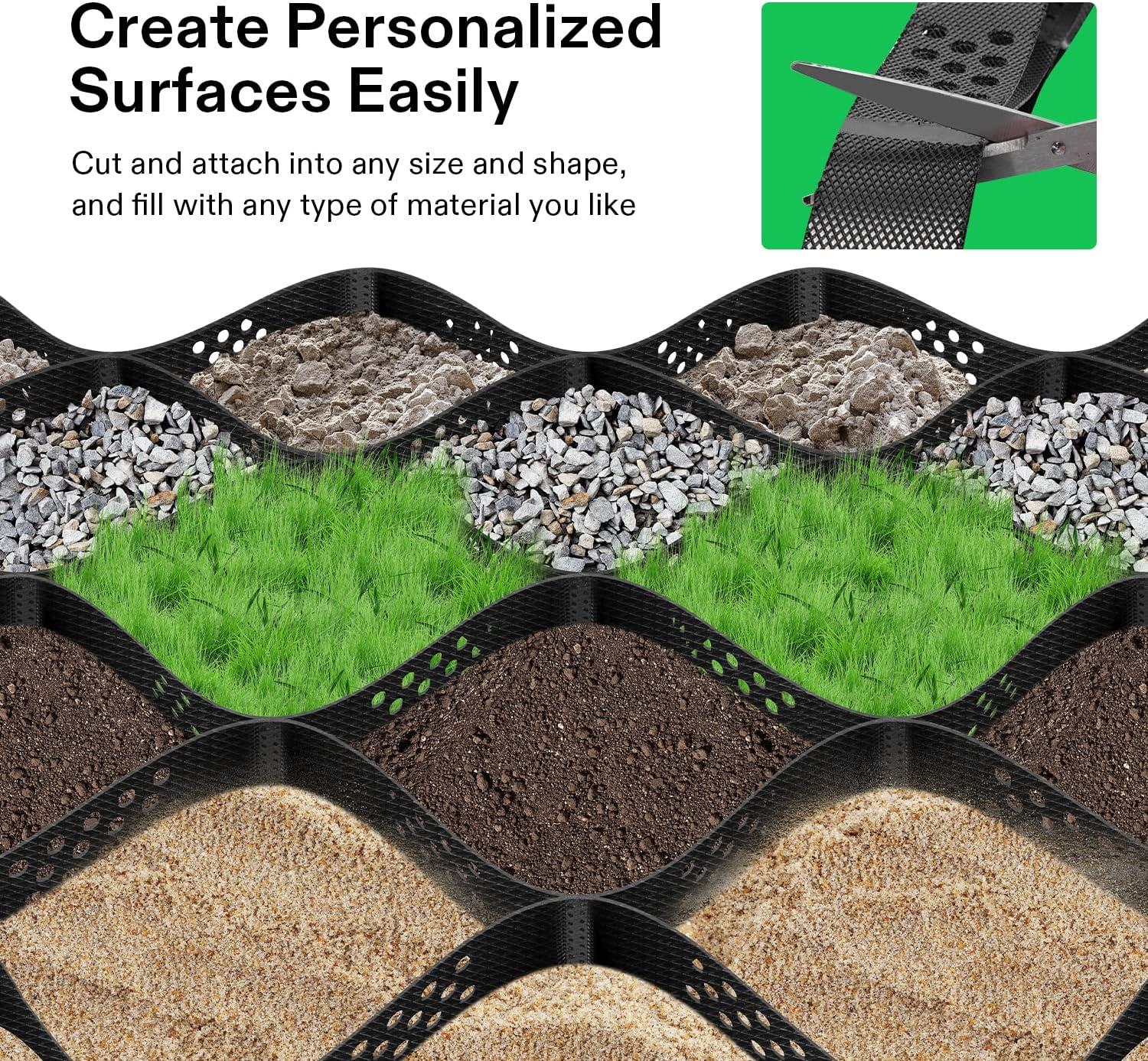 Easy DIY: You can cut and attach the geocells into any size and shape, creating personalized substantial surfaces for flat areas or slopes; Installation is easy with just in three steps – spread it out, anchor it to the ground, fill and connect it – then it's ready to use