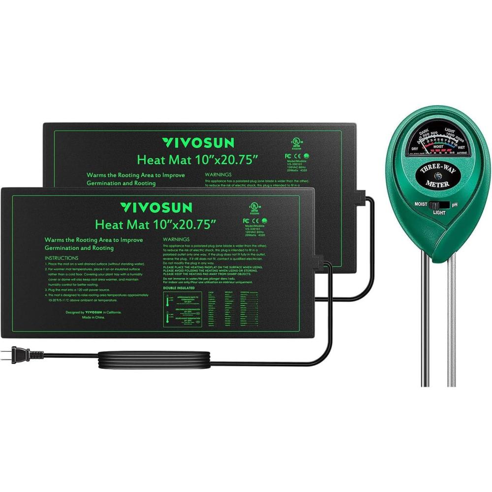 VIVOSUN 2 Pack Durable Waterproof Seedling Heat Mat Warm Hydroponic Heating Pad 10 x 20.75 Inch VIVOSUN Soil Tester, 3-in-1 Plant Moisture Meter Light and PH Tester for Home, Garden, Lawn, Farm, Indoor and Outdoor Use, Promote Plants Healthy Growth