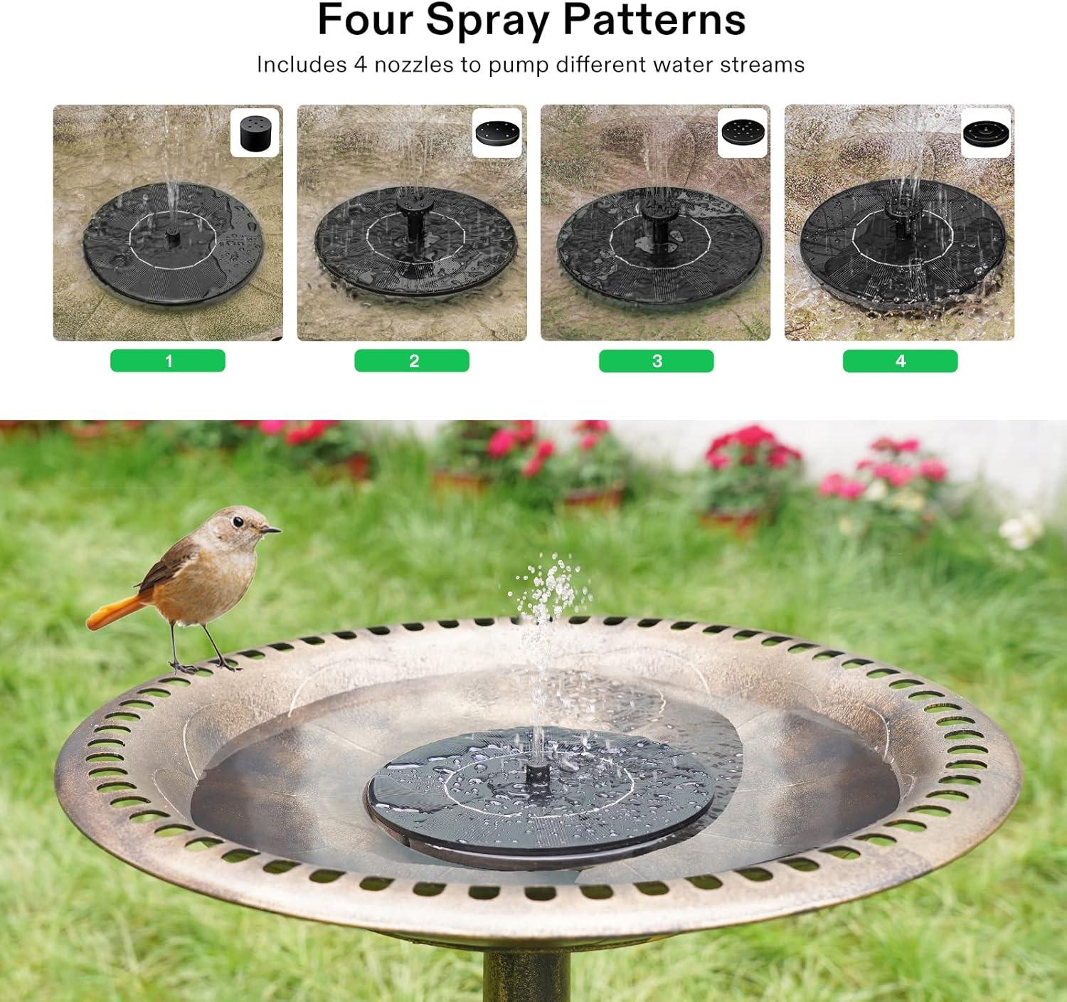 Four Spray Patterns: This solar fountain pump includes 4 nozzles to pump different water streams, it is easy to install and replace the pump head; It is the ideal pump for many uses, such as bird baths, small ponds, fish tanks and oxygen water circulation