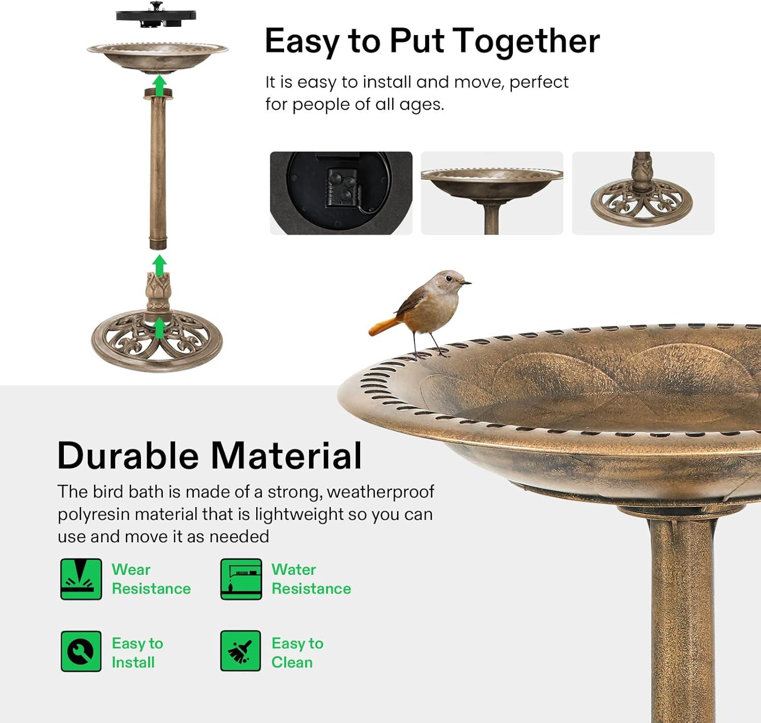 Durable Material: The bird bath is made of a strong, weatherproof polyresin material that is lightweight so you can use and move it as needed; It won't dent, crack or break, making it durable and perfect for outdoor use and a beautiful addition to your garden or patio