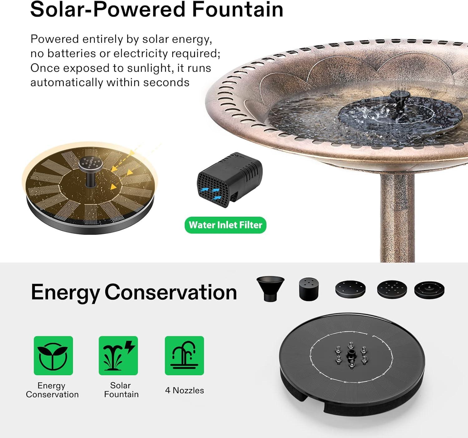 Solar-Powered Fountain: This solar fountain pump is powered entirely by solar energy, no batteries or electricity required; Once exposed to sunlight, it runs automatically within seconds; Large 20-inch diameter birdbath holds enough water for several birds to use at the same time