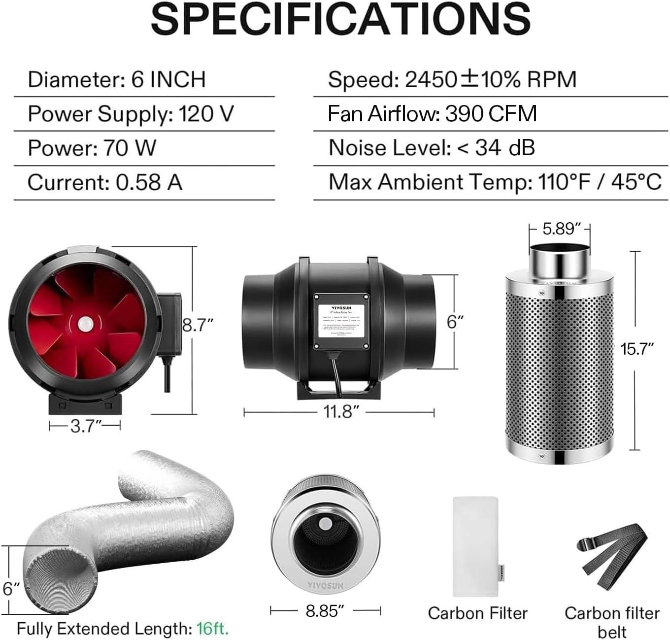 VIVOSUN Grow Tent Ventilation System, 8 Inch Inline Duct Fan with Speed Controller, 8” Carbon Filter, and 25ft. Ducting Combo, Air Cooling and Filtration Kit for Grow Tent, Hydroponics(6 Inch)