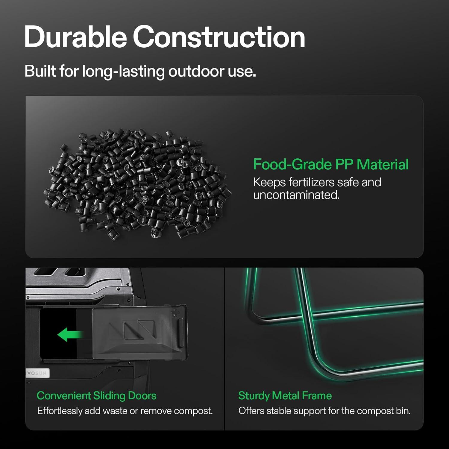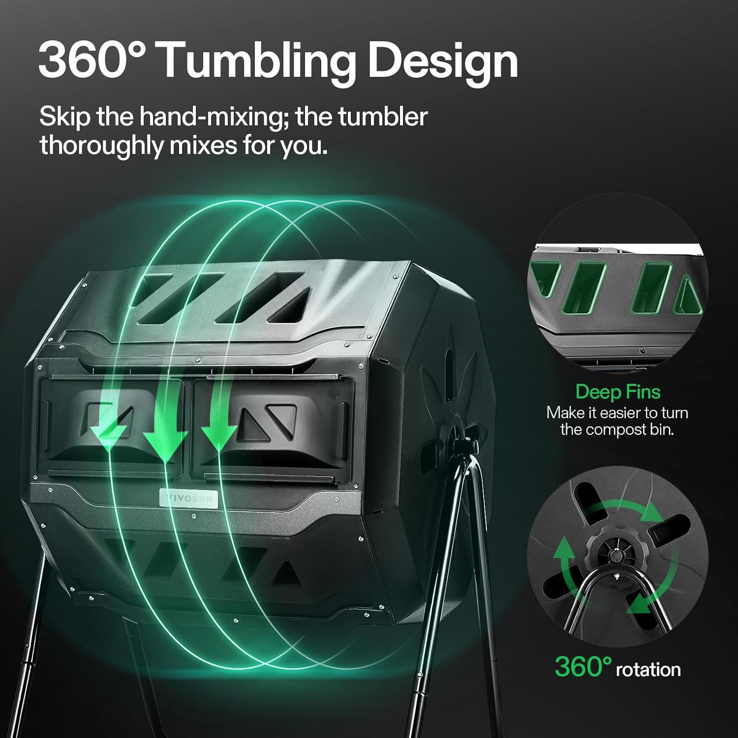 Twin Chambers: Designed with 2 chambers, the tumbling composter allows you to compost in batches; One side “cooks” while you add fresh organic material to the other, allowing for an efficient, uninterrupted flow of rich, healthy compost