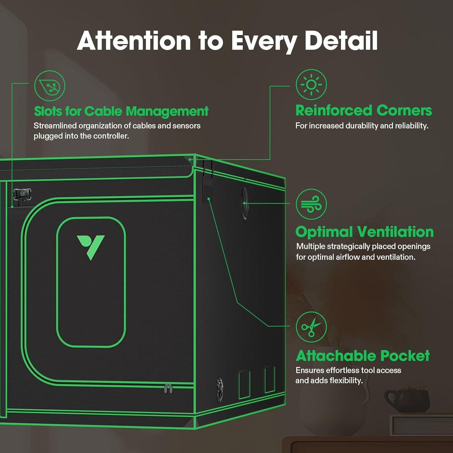 Upgraded Lightproof Fabric: Durable 2000D Oxford canvas lined with plant-friendly PE and 100%-reflective Mylar; The three-layer thick fabric ensures zero light leaks, boosting the output efficiency of your setup; Zipper section is designed with black inner lining for enhanced light prevention