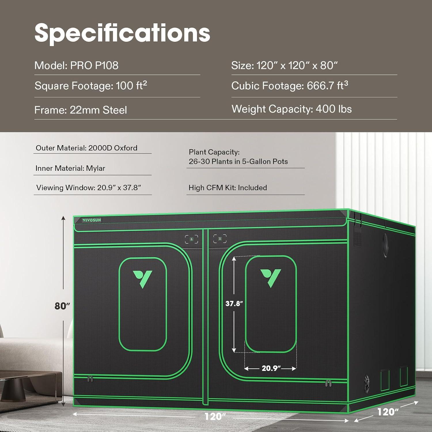 VIVOSUN P105 120"×60"×80" PRO Grow Tent, with Thick 1 inch Poles, Strengthened High Reflective Mylar Oxford Fabric, Extra Hanging Bars & High CFM Kit for Hydroponics Indoor Plant for VSFD6500×2(120"x120"x80")