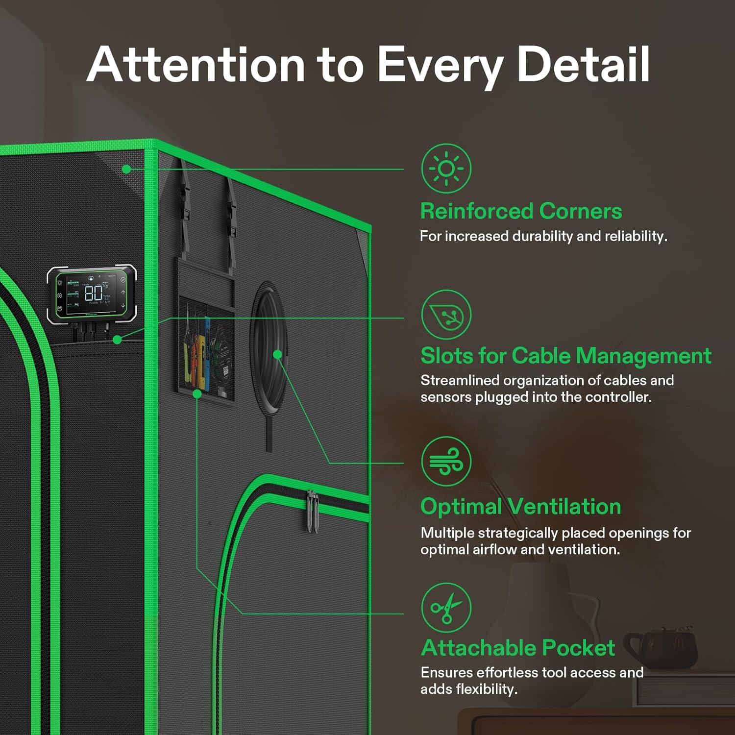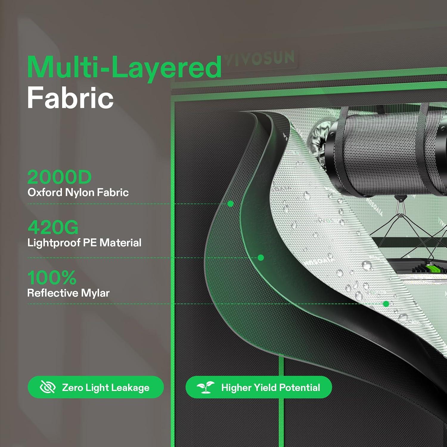 Upgraded Lightproof Fabric: Durable 2000D Oxford canvas lined with plant-friendly PE and 100%-reflective Mylar; The three-layer thick fabric ensures zero light leaks, boosting the output efficiency of your setup; Zipper section is designed with black inner lining for enhanced light prevention
