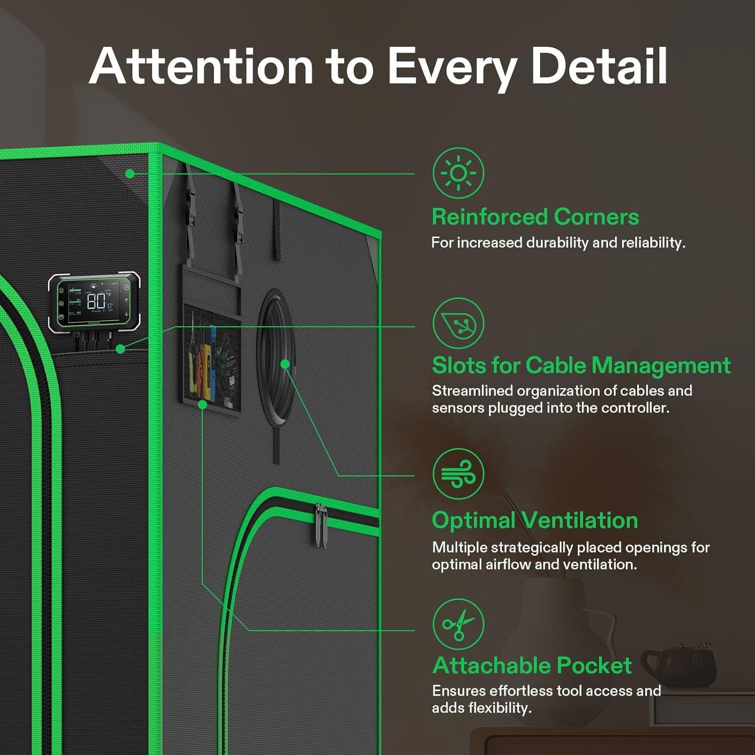 Upgraded Lightproof Fabric: Durable 2000D Oxford canvas lined with plant-friendly PE and 100%-reflective Mylar; The three-layer thick fabric ensures zero light leaks, boosting the output efficiency of your setup; Zipper section is designed with black inner lining for enhanced light prevention