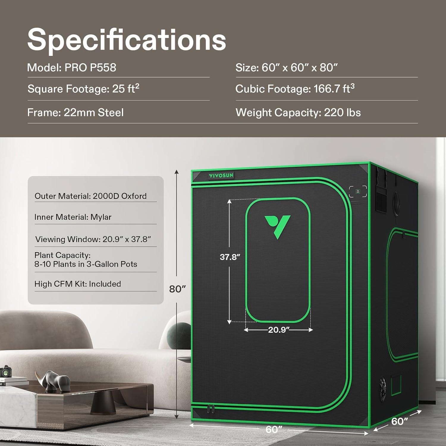 VIVOSUN P105 120"×60"×80" PRO Grow Tent, with Thick 1 inch Poles, Strengthened High Reflective Mylar Oxford Fabric, Extra Hanging Bars & High CFM Kit for Hydroponics Indoor Plant for VSFD6500×2(60"x60"x80")