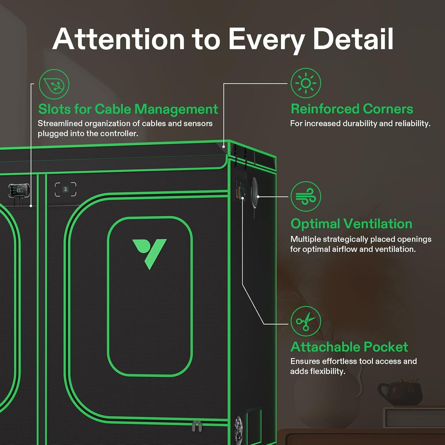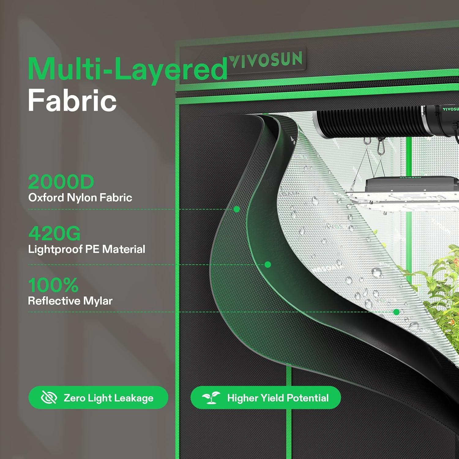 Upgraded Lightproof Fabric: Durable 2000D Oxford canvas lined with plant-friendly PE and 100%-reflective Mylar; The three-layer thick fabric ensures zero light leaks, boosting the output efficiency of your setup; Zipper section is designed with black inner lining for enhanced light prevention