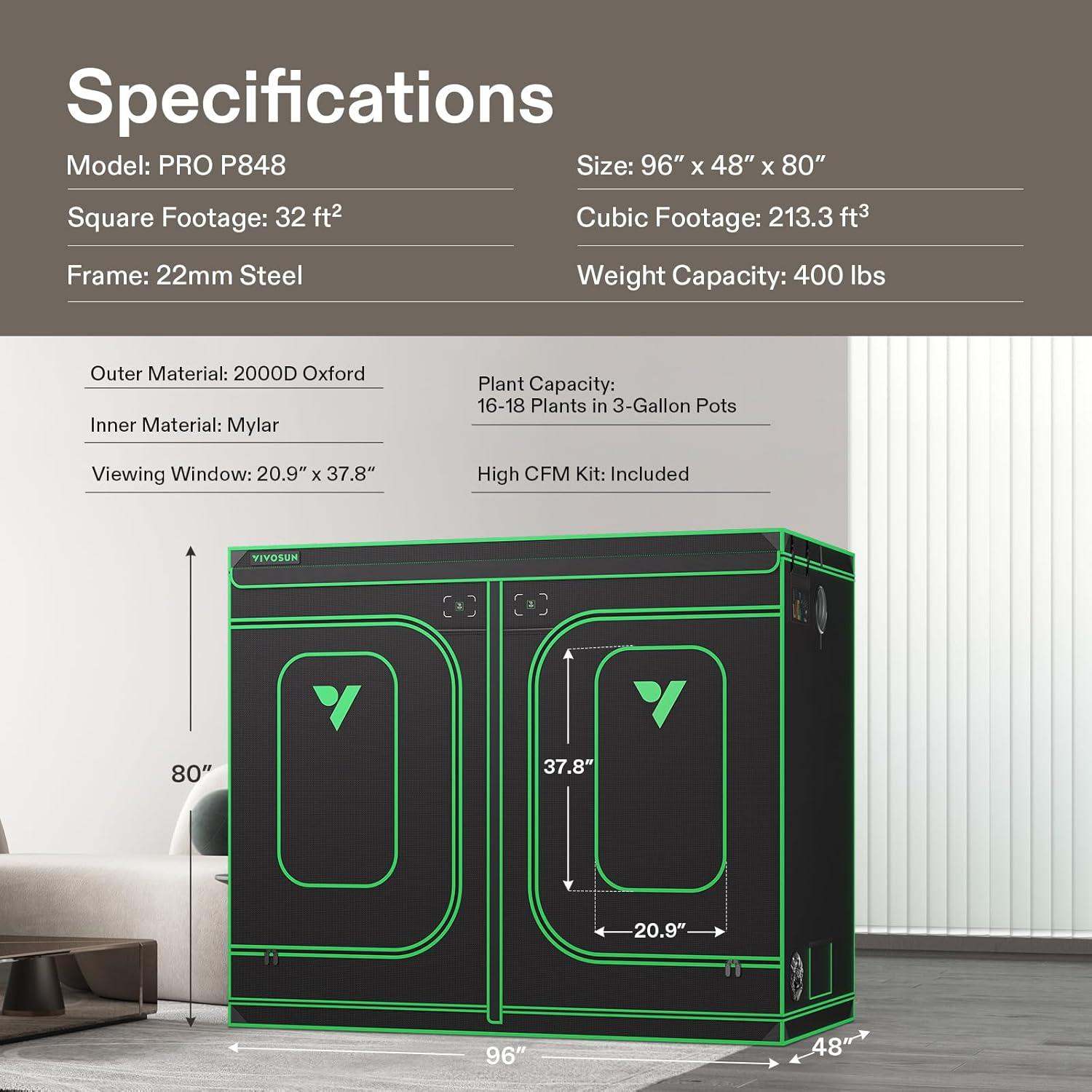 VIVOSUN P105 120″×60″×80″ PRO Grow Tent, with Thick 1 inch Poles, Strengthened High Reflective Mylar Oxford Fabric, Extra Hanging Bars & High CFM Kit for Hydroponics Indoor Plant for VSFD6500×2(96″x96″x80″)