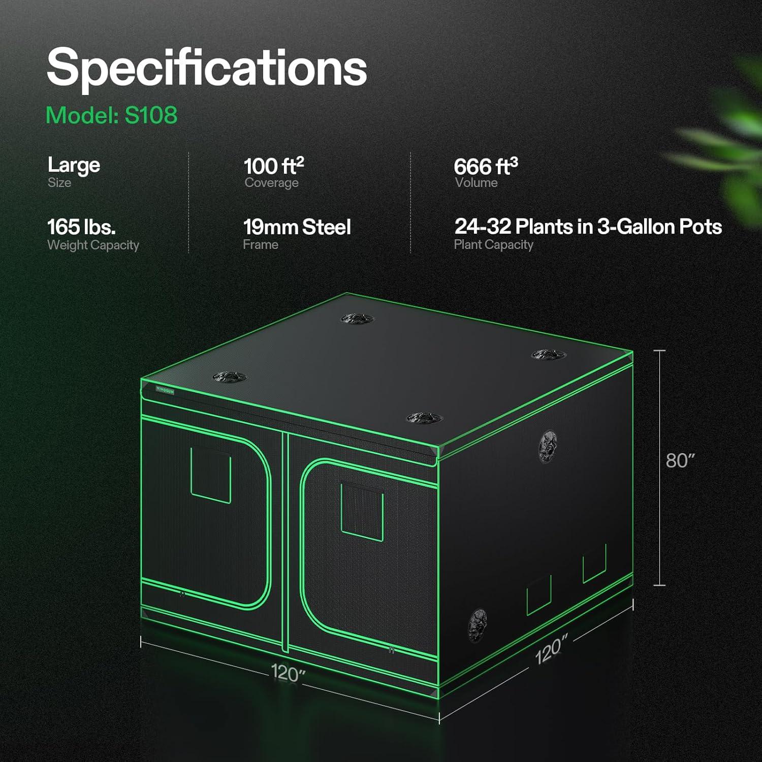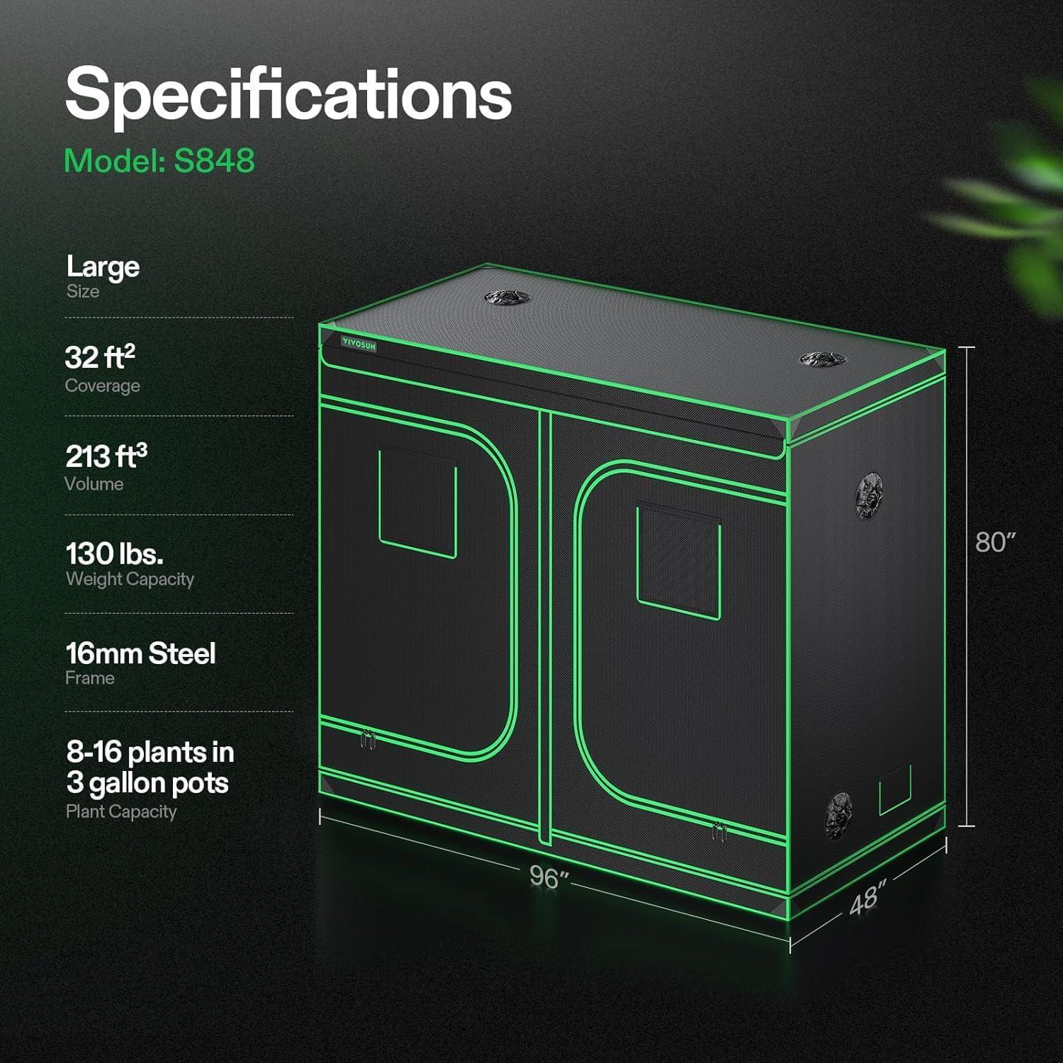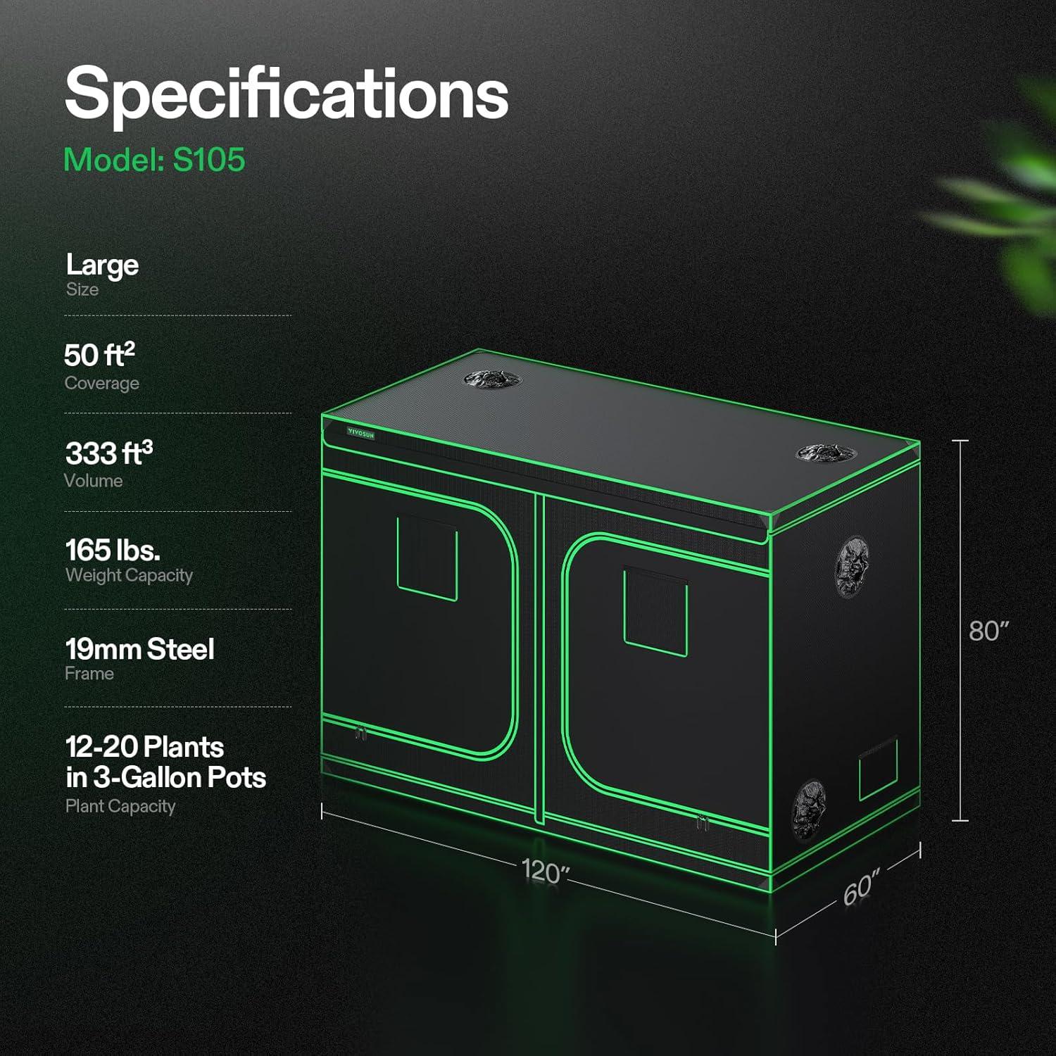 Stand Sturdy & Extra-thick Materials: The indoor tent is supported with strong metal poles, top bars, and tool-free corner connectors to lock the structure securely in place; The top hanging bar can hold up to 250 lbs. each that can satisfy your different equip requirements; The premium 340 g high-density fabric is waterproof, tear-resistant and double-stitched for great light blockage, while the inside lining is designed with PE material and mylar walls that are safer for your plants