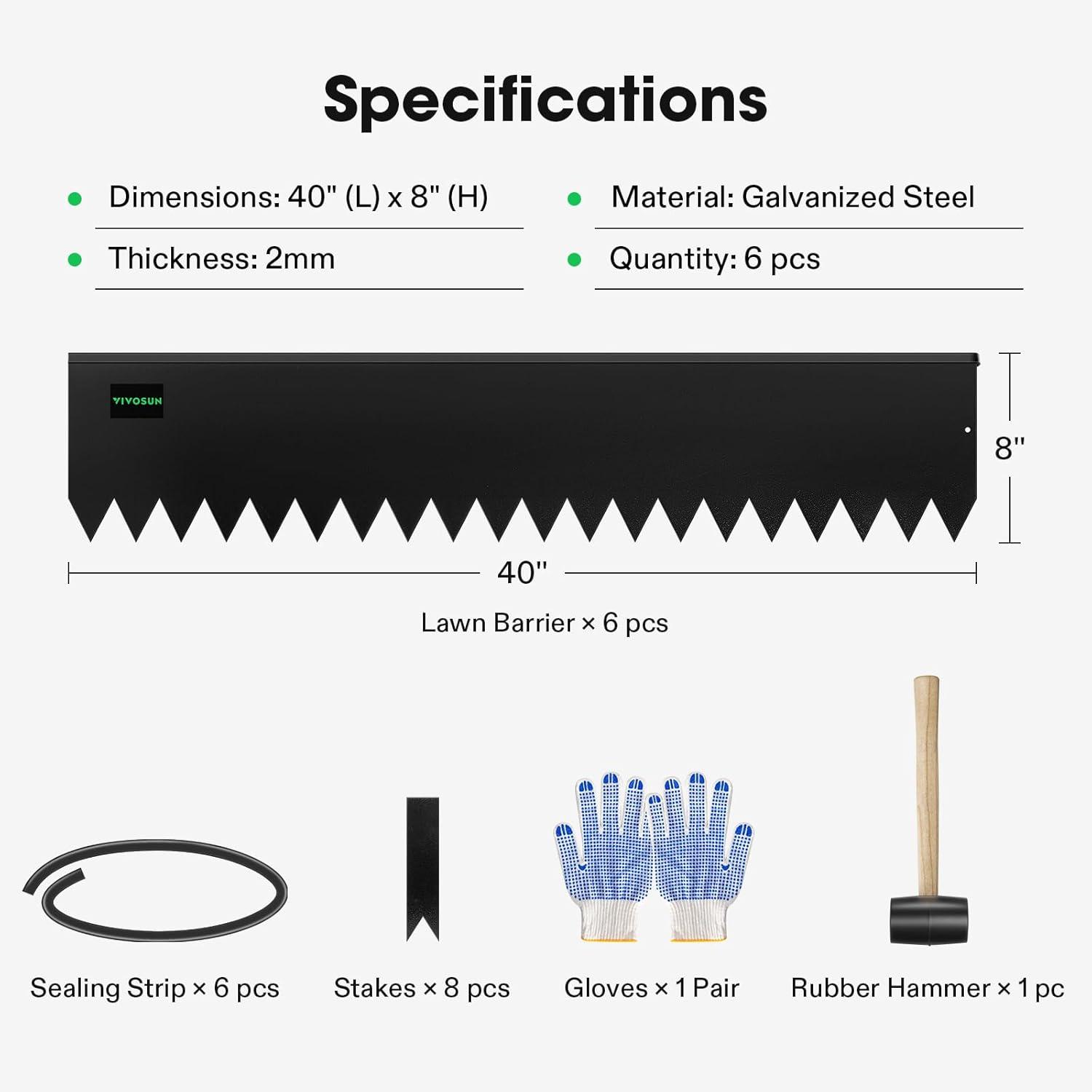 Complete Landscape Edging Kit: Includes 6 steel edge barriers (40”x8”), 8 stakes, 6 sealing strips, a pair of gloves, and a rubber hammer; The included gloves and hammer provide added assistance during setup, while the rubber sealing strips offer increased safety, preventing accidental injuries (The barriers are carefully packed to prevent cuts from the sharp corners during unpacking)
