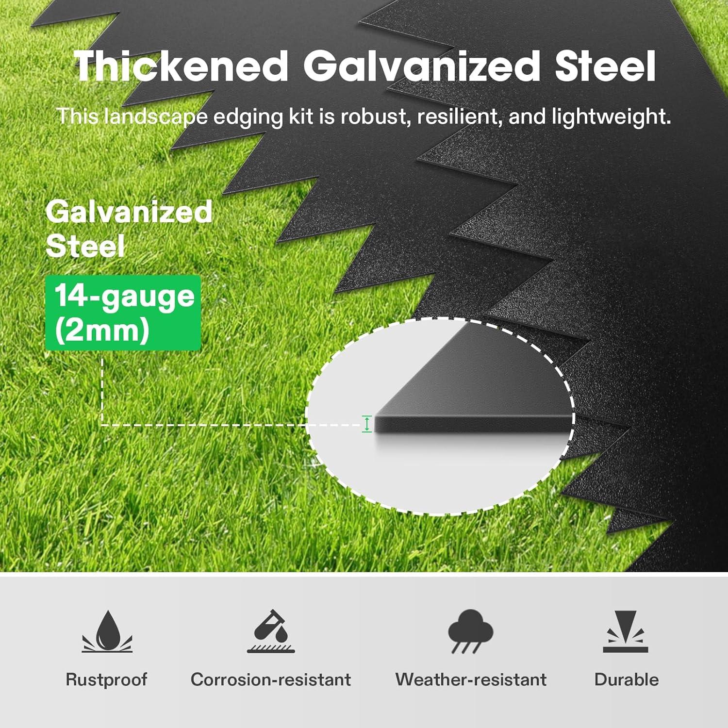Sturdy & Durable: Crafted from 14-gauge (2mm) galvanized steel, this landscape edging kit is robust, resilient, and lightweight. Its rust-free, corrosion-proof, and weatherproof design ensures long-lasting use for years to come